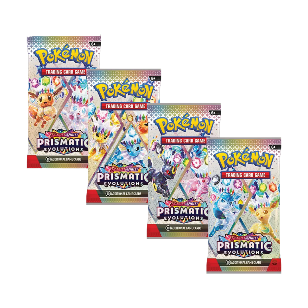 Open the door to a new evolution in the Pokémon TCG with a booster pack from Prismatic Evolutions, a long-awaited set in the Scarlet & Violet series that celebrates Eevee and its evolutions! Each booster pack contains 10 playing cards, with a chance at EX cards , Illustration Rares , and exciting Trainer cards.