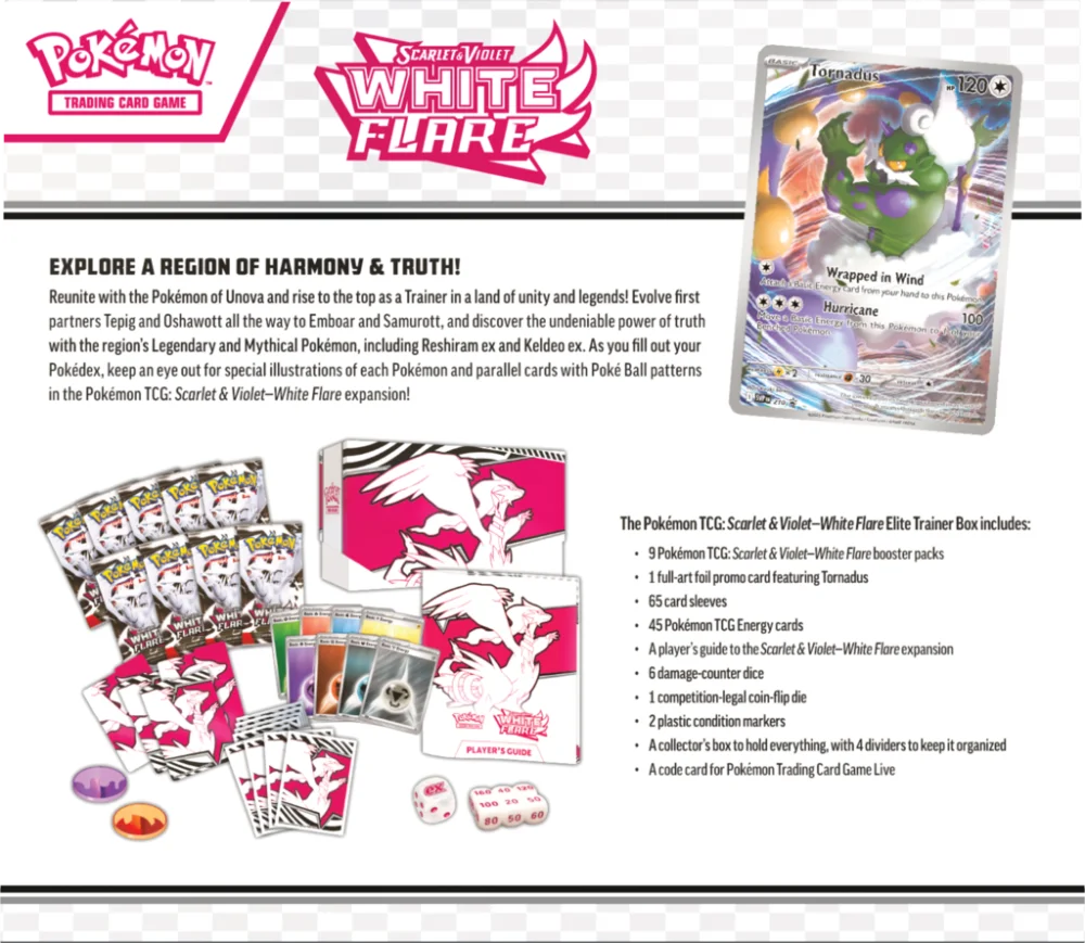 Med en White Flare Elite Trainer Box får du 9 boosterpaket med Scarlet & Violet 10.5 (SV10.5), ett Tornadus Illustration Rare-promokort och en massa speltillbehör.